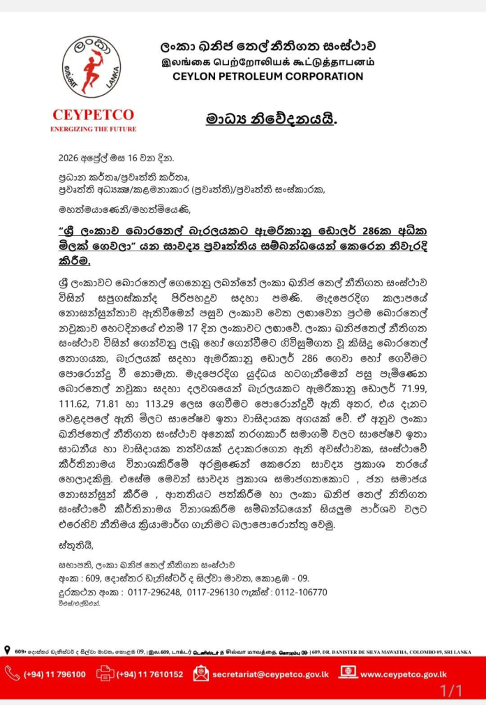 මේ අතර ලංකා ඛනිජ තෙල් නීතිගත සංස්ථාව (CPC) ප්රකාශයක් නිකුත් කරමින් එම පුවත ප්රතික්ෂ්ඓඑප කර ඇත . එම සංස්ථාවේ සභාපතිවරයා විසින් නිකුත්කර ඇති නිවේදනයක සඳහ වන්නේ ඉහළ මිලකට බොරතෙල් මිලට ගත් පුවත සාවධ්ය බවයි .