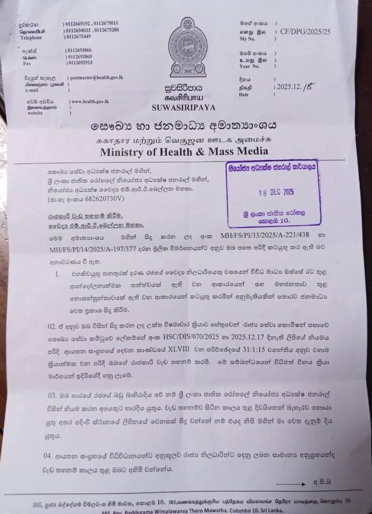 The letter issued in this regard states that his services have been suspended for making statements to the media without approval, acting in a manner that has created a controversial situation in the country through various media, as a government medical officer holding a responsible position.