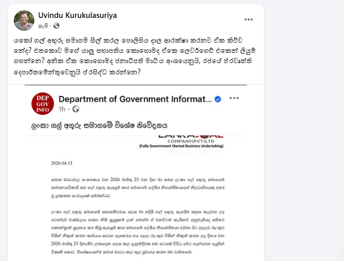 Meanwhile, a journalist in England, Uvindu Kurukulasuriya, has posted a note about this on his social media account. He is questioning how the Chairman of a company that was sealed by the Criminal Investigation Department yesterday can issue a press release today on its letterhead.